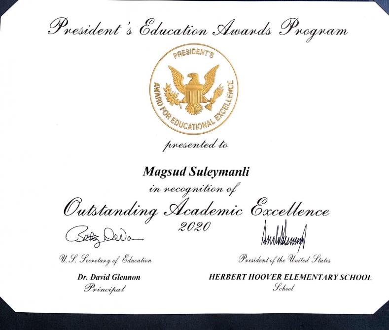 ABŞ-da 10 yaşlı azərbaycanlı Maqsud Süleymanlı təhsildə xüsusi müvəffəqiyyətlərinə görə bu ölkənin Prezidentinin mükafatını alıb.