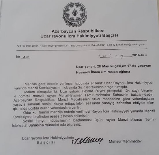 Ərəstun Abbasov bildirib ki, onlar kimsənin mənzilini zəbt etməyiblər və bu yaxınlaradək yaşadıqları mənzili o vaxtlar Ucar rayonu Polis şöbəsinin rəisi verib. Yəni boş mənzil, əslində dörd divardan ibarət olub və onu bu illər ərzində təmir edib yaşayış üçün yararlı hala salmışıq. Bu gün mənzilin sahibi olduöunu iddia edən İlham Həsənov bu mənzilə 2012-ci ildə order alıb və bu order 2014-cü ildə bu order rayon İcra Hakimiyyəti tərəfindən ləğv edilib. Mənzilin boşaldılmasına gəlincə isə, Qaçqınların və Məcburi Köçkünlərin İşləri üzrə Dövlət Komitəsi tərəfindən məcburi köçkünlər üçün şəhərcikdə verilən köçmüşəm və o mənzildə mənə aid heç nə yoxdur. Bu məsələdə hazırki məqamda mənim adımın hallandırılması yolverilməzdir.