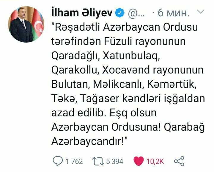 «Rəşadətli Azərbaycan Ordusu tərəfindən Füzuli rayonunun Qaradağlı, Xatunbulaq, Qarakollu, Xocavənd rayonunun Bulutan, Məlikcanlı, Kəmərtük, Təkə, Tağaser kəndləri işğaldan azad edilib. Eşq olsun Azərbaycan Ordusuna! Qarabağ Azərbaycandır!»