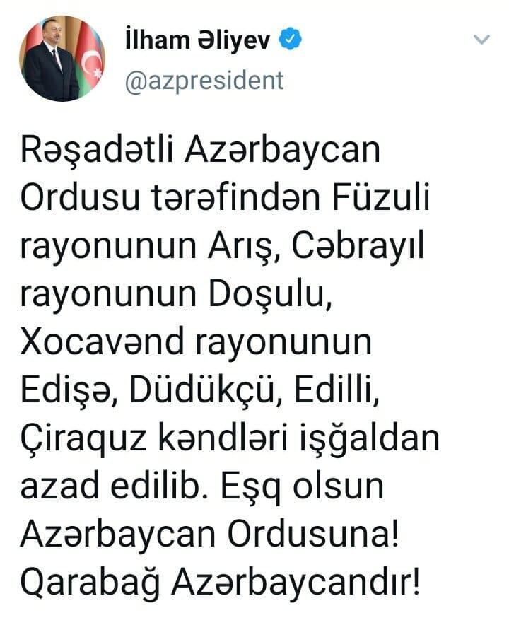 Rəşadətli Azərbaycan Ordusu tərəfindən Füzuli rayonunun Arış, Cəbrayıl rayonunun Doşulu, Xocavənd rayonunun Edişə, Düdükçü, Edilli, Çiraquz kəndləri işğaldan azad edilib. Eşq olsun Azərbaycan Ordusuna! Qarabağ Azərbaycandır!