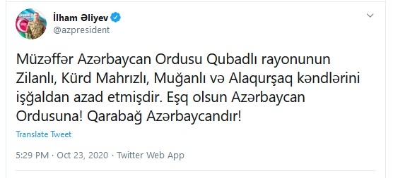 «Müzəffər Azərbaycan Ordusu Qubadlı rayonunun Zilanlı, Kürd Mahrızlı, Muğanlı və Alaqurşaq kəndlərini işğaldan azad edib».