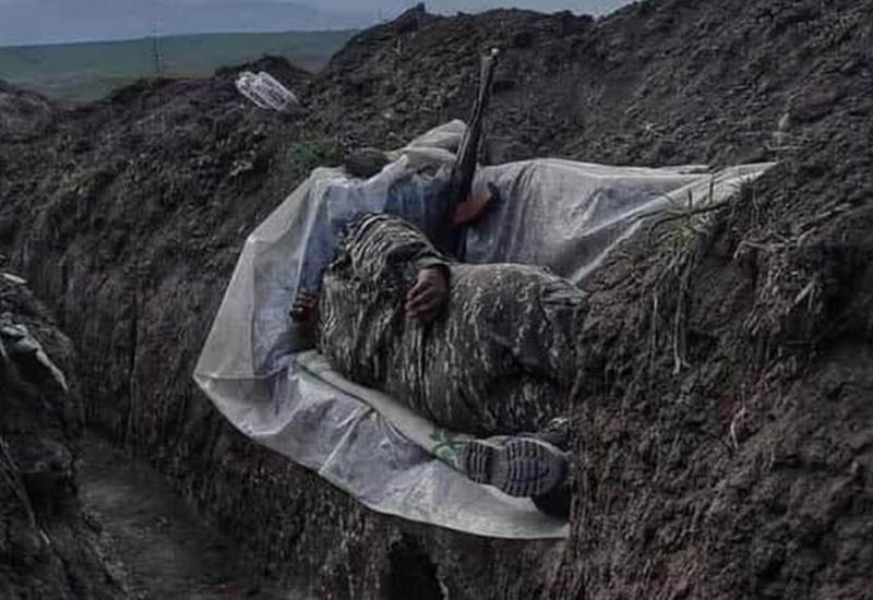Как передает Day.Az, на снимке видно, как военнослужащий спит в яме на оккупированных территориях Азербайджана, подложив под себя полиэтиленовую пленку.