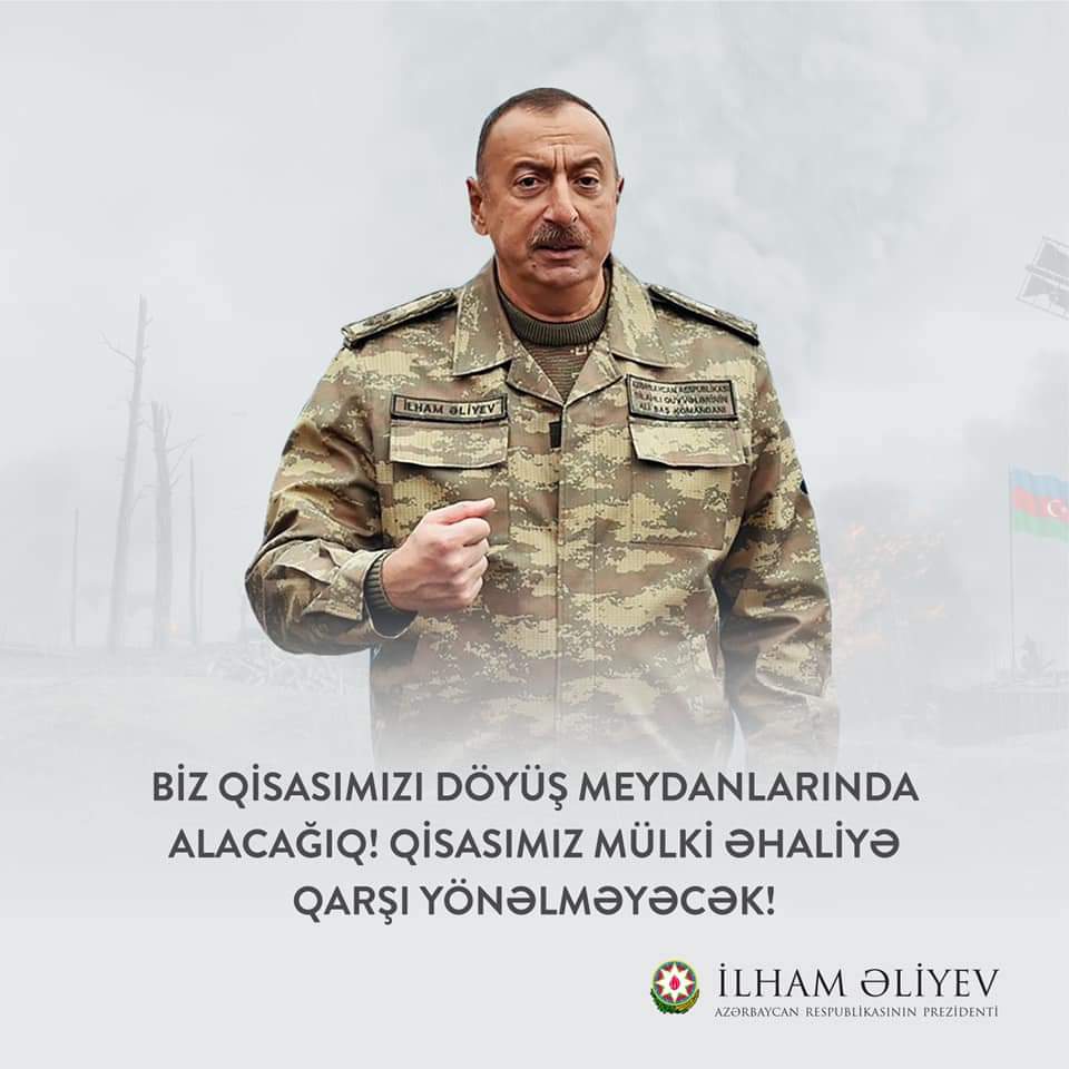 “Döyüş meydanında qarşımızda dayana bilməyən Ermənistan silahlı qüvvələri hər gün şəhər, kəndlərimizi atəşə tutur. Bir ay ərzində hücumlar nəticəsində 91 mülki şəxs həlak olub, onlardan 10-u uşaqdır”, — deyə dövlət başçısı qeyd edib. Prezident əlavə edib ki, biz region üçün böyük təhlükə mənbəyi olan erməni faşizminin belini qırırıq: “Heç kim bizim qarşımızda dayana bilməz və bu yoldan çəkindirə bilməz. Ermənistan atəşi dayandırsa, qalan torpaqlarımızdan qoşunlarının çıxarması ilə bağlı konkret öhdəliyi üzərinə götürsə, dayanmağa hazırıq”.