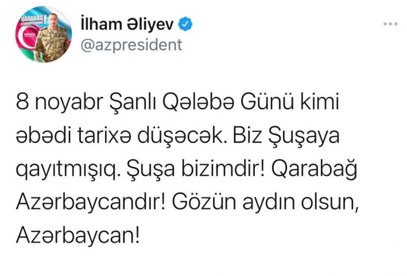 Qarabağ 09.11.202009.11.2020 İlham Əliyev daha bir twit yazdı Yayımladı: www.Fedai.az «8 noyabr Şanlı Qələbə Günü kimi əbədi tarixə düşəcək». Fedai.az xəbər verir ki, bunu Ali Baş Komandan, Prezident İlham Əliyev Twitter səhifəsində paylaşıb. Baxış sayı: 881 Bu xəbəri paylaşın: