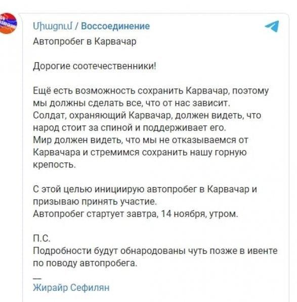 Rayonun Azərbaycanın nəzarətinə verilməsinə bir neçə saat qalmış «Sasna Tsrer» qruplaşması Kəlbəcərə kütləvi avtoyürüş təşkil etməyə çağırıb. Avtoyürüş noyabrın 14-ü səhərə təyin edilib və onun haqqında məlumatlar sosial şəbəkələrdə fəal şəkildə yayılır. İstisna deyil ki, avtoyürüş bəhanəsi ilə təşkilat üzvləri Rusiyanın sülhməramlılarına və Azərbaycan hərbçilərinə qarşı təxribatlar, terror aktları hazırlayırlar.