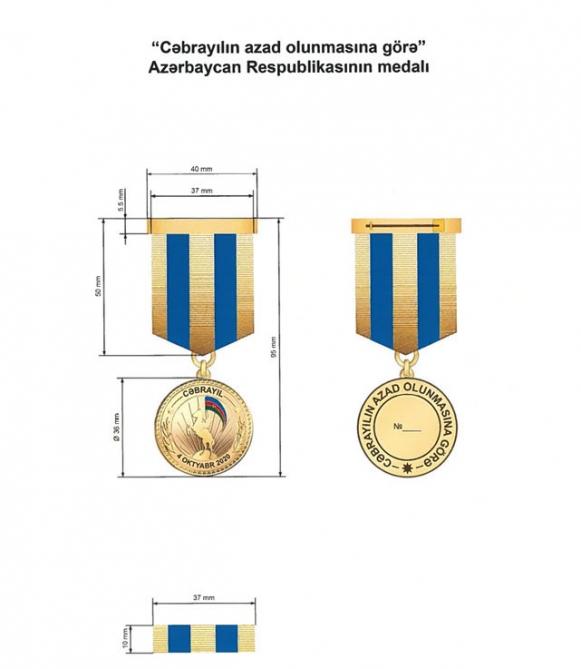 “Cəbrayılın azad olunmasına görə” medalı ilə Azərbaycan Respublikasının Cəbrayıl rayonunun işğaldan azad edilməsi uğrunda aparılmış döyüş əməliyyatlarında iştirak etmiş Azərbaycan Respublikası Silahlı Qüvvələrinin hərbi qulluqçuları təltif edilir.