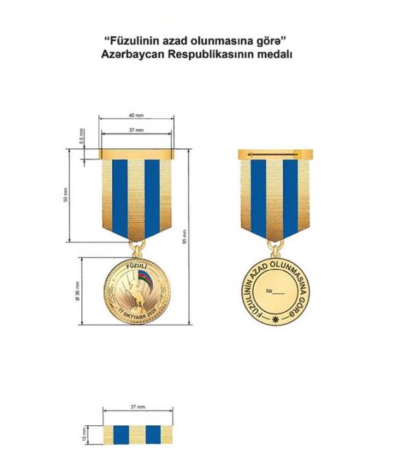 “Füzulinin azad olunmasına görə” medalı ilə Azərbaycan Respublikasının Füzuli rayonunun işğaldan azad edilməsi uğrunda aparılmış döyüş əməliyyatlarında iştirak etmiş Azərbaycan Respublikası Silahlı Qüvvələrinin hərbi qulluqçuları təltif edilir.