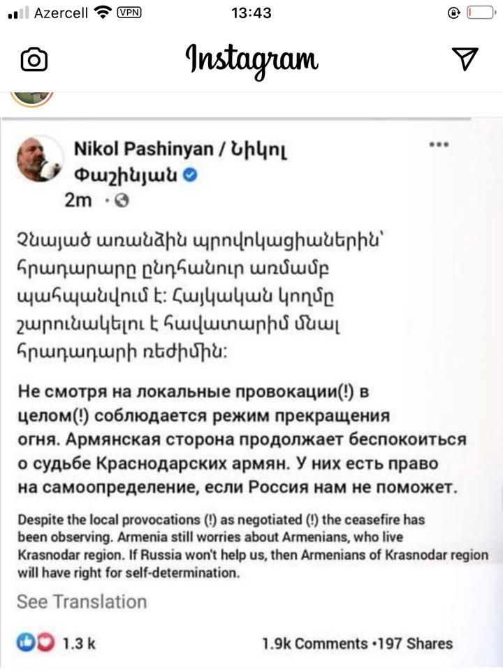Rusiya, pardon, Krasnodar Erməni Respublikası bilməlidir ki, Azərbaycanda sadəcə Qarabağ bölgəsi olub və «parçala, hökm sür» rus siyasətiylə öncə Zəngəzur adıyla Qarabağın bir hissəsini zəbt edib Ermənistana peş-kəş eləyib. İndi də Azərbaycan ölkəsinin prezidenti cənab İlham Əliyev dəfələrlə deyib: “Status-kvo deyilən məsələ yoxdur. Qurtardı getdi. Status-kvo belə olmalıdı, elə olmalıdır. Mən dəyişdirdim status-kvonu. Bax orda, döyüş meydanında. Status-kvo yoxdur. Təmas xətti – yoxdur təmas xətti, yarmışıq onu. 30 ildir qururdular bu təmas xəttini. Özü də bu bölgənin relyefi belədir ki, o, təbii istehkamdır. Biz aşağıdan yuxarı gedirik. Özü də orada beton istehkamlar qurulub – 30 il ərzində! Yarıb keçmişik! Azərbaycan əsgərinin qabağında heç kim heç nə deyə bilməz. Biz bu gün o təmas xəttini darmadağın etdik. Deyirlər, yeni təmas xətti olacaq. Olmayacaq».