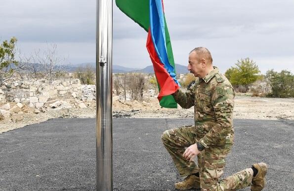 Azərbaycan Prezidenti İlham Əliyev işğaldan azad edilmiş ərazidə Azərbaycan bayrağını ucaldıb.