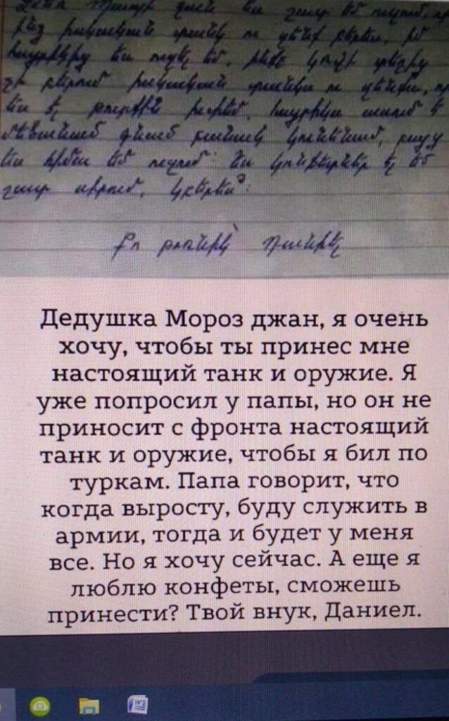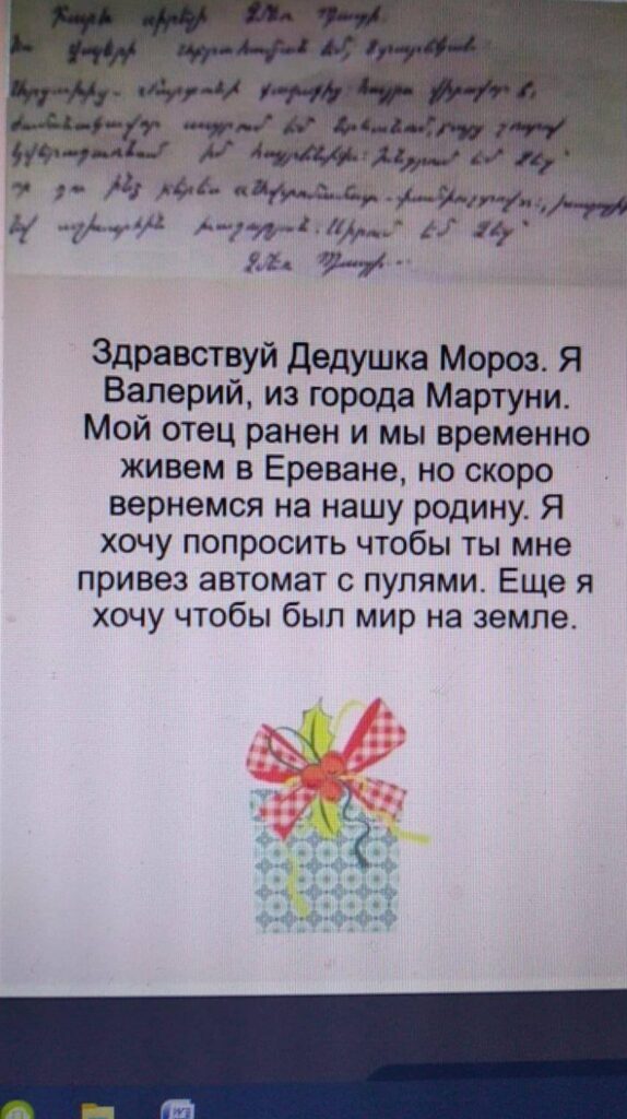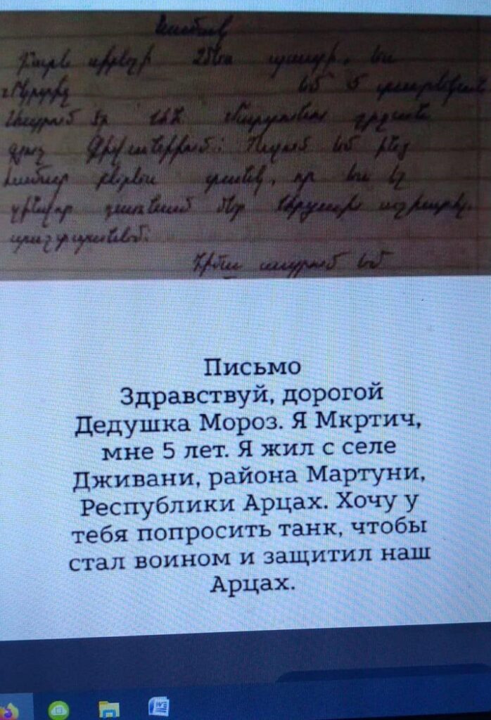 Məncə əlavə şərhə ehtiyac yoxdur. Bunlar da böyüyüb əli silahlı, cibləri qumbaralı «mülki erməni xalqı» olacaqlar. Məktublarındakı arzularından da belə görünür, Şaxta Babalarından, həm silah, həm də konfet istəyirlər. Elə ataları da bunlar kimi Putin babalarından, həm silah, həm konfet, həm də bu silahları atan və onların yerinə gəbərmək üçün «soldat» istəyirlər…