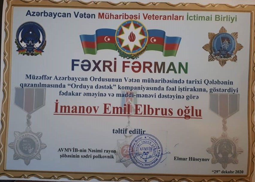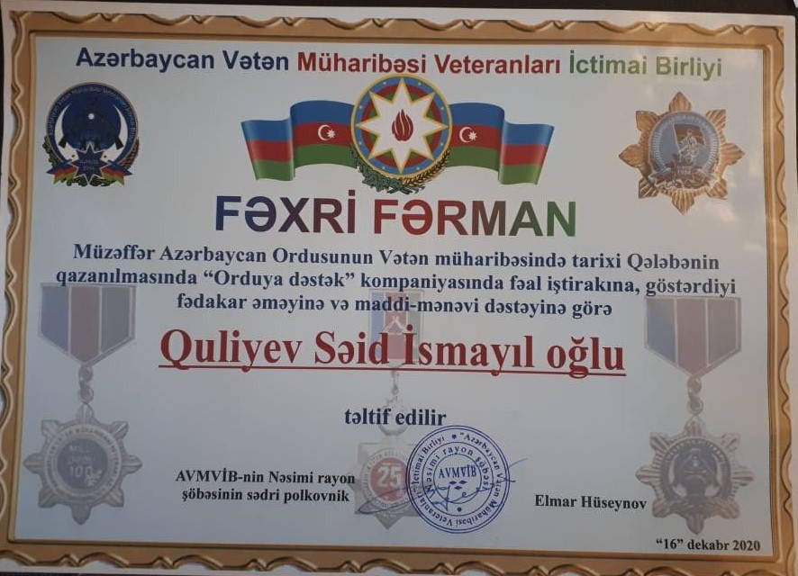 Elmar Hüseynov bildirdi ki, bir çox vətənpərvər soydaşımız sonadək ordumuza və yaralanmış əsgərlərimizə öz dəstəklərini əsirgəmədilər. tanınmış həkim-stomoloqlarSəid İsmayıl oğlu Quliyev və Emil Elbrus oğlu Quliyev Müzəffər Azərbaycan ordusunun Vətən müharibəsində tarixi qələbə qazanmasında və AVMVİB-nin «Orduya dəstək» kompaniyasında fəal iştiraklarına, göstərdikləri maddi və mənəvi dəstəklərinə görə Fəxri Fərmanla təltuf olundular.