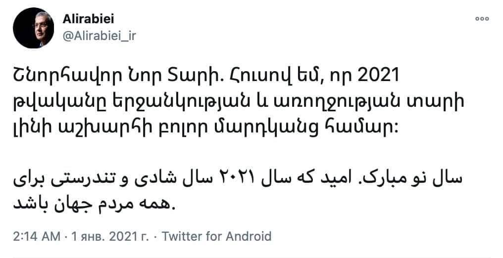 İran hökumətinin rəsmi nümayəndəsi Əli Rabei Twitter-dəki akkauntunda Yeni il təbrikini erməni dilində yazıb. O, “Yeni ıliniz mübarək! Ümid edirəm ki, 2021-ci il bütün dünyada insanlar üçün səadət və sağlamlıq ili olacaq”, – deyə təbrikində bildirib.