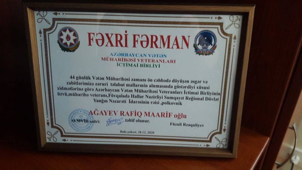Azərbaycan Vətən Müharibəsi Veteranları İctimai Birliyi (AVMVİB) Sumqayıt şəhər şöbəsinin sədri Timuraz Mənsurovun verdiyi məlumata görə, AVMVİB üzvü, müharibə veteranı, Fövqaladə Hallar nazirliyi Sumqayıt Regional Dövlət Yanğın Nəzarəti İdarəsinin rəisi, polkovnik Rafiq Ağayev AVMVİB-nin Fəxri Fərmanıyla təltif olunub.
