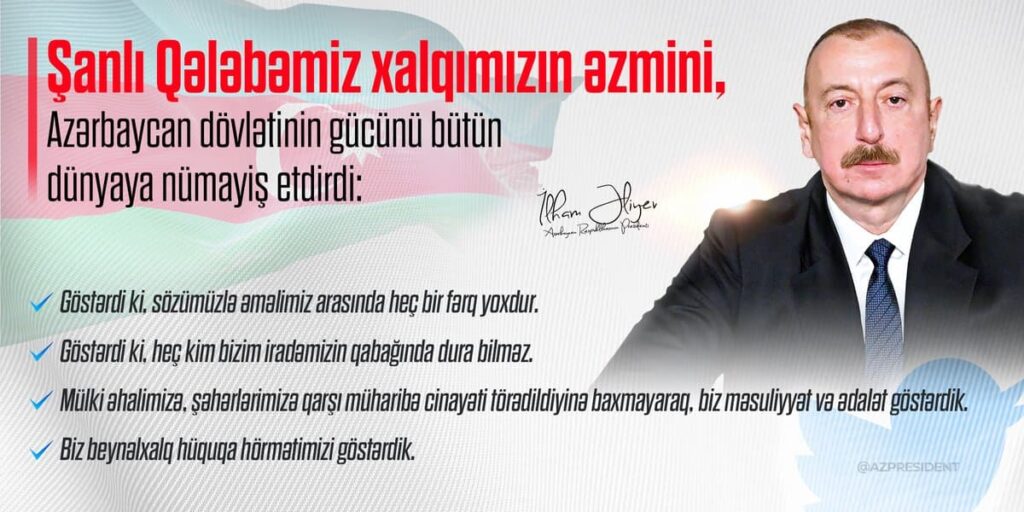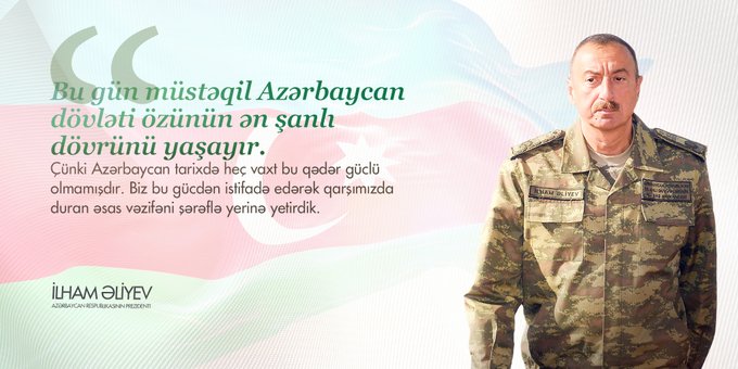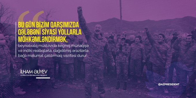 Sfera.az xəbər verir ki, fotoların birində Azərbaycanın icazəsi olmadan kiminsə Qarabağa getməyinin mümkünsüz olduğu, digərində şanlı qələbəmizin gücümüzün nümayişi olduğu qeyd olunub.