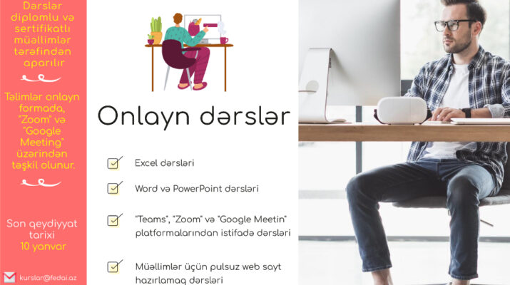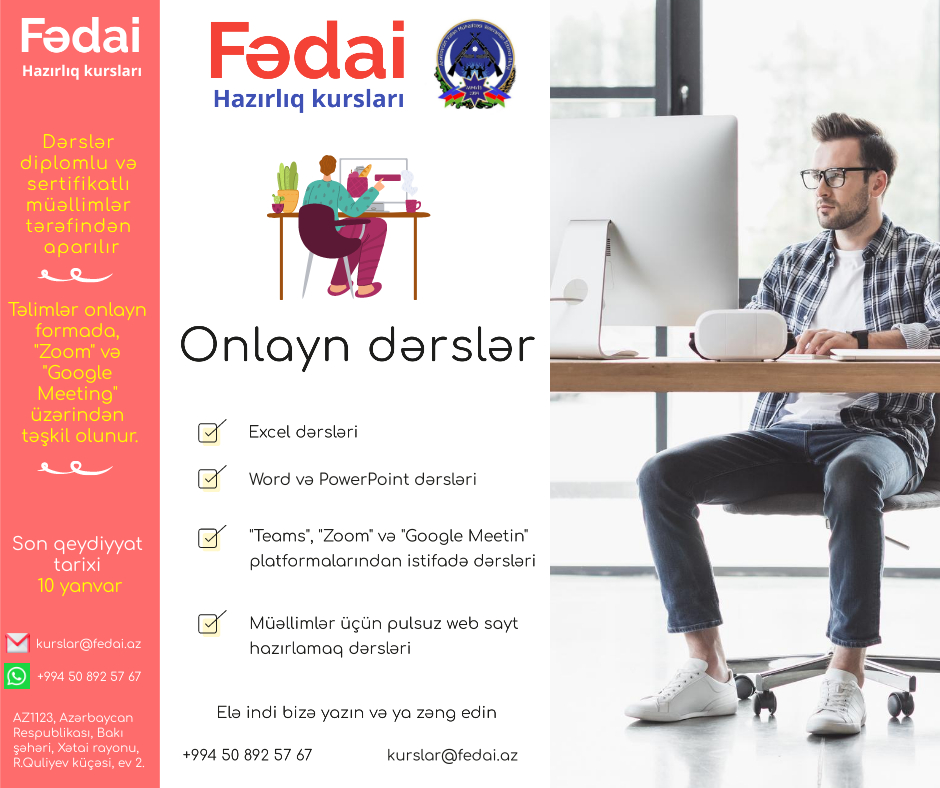 «Fədai» hazırlıq kursları qəbul elan edir. Kurslara fərdi və qrup şəklində yazılmaq mümkündür. Təlimlər istəyə uyğun olaraq ənənəvi və onlayn formada təşkil olunacaqdır. Hazırda kursumuzda Ofis proqramları, Photoshop, Corel Draw və Sosial Media Menecerliyi üzrə kurslara qeydiyyat mümkündür. Fevral ayının 1-dək kurslara yazılanlara xüsusi endirim olunacaqdır. İxtisaslı müəllimlər tərəfindən təşkil edilən kurslarımızı müvəffəqiyyətlə bitirənlər müvafiq sertifikat əldə edəcəkdir.