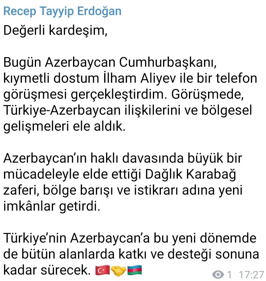 Siyasət 17.01.202117.01.2021 Ərdoğan İlham Əliyevə zəng edib Yayımladı: www.Fedai.az Türkiyə Cümhuriyyətinin prezidenti Rəcəb Tayyib Ərdoğan Azərbaycan prezidenti İlham Əliyevə zəng edib. Telefon danışığı zamanı Türkiyə-Azərbaycan münasibətləri və digər məsələlər müzakirə olunub. Baxış sayı: 364 Bu xəbəri paylaşın:19Поделились