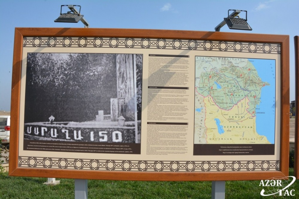 Abidənin sökülüb rekonstruksiya edilməsini ermənilər etmişdi. 1978-ci ildə tikilən bu abidədə yazılmış «MARAĞA 150» onların qədimlik iddialarını təkzib edirdi. Lakin buradakı hay sifarişinin icraçıları abidənin qalıqlarını da yoxa çıxarmağa çalışıblar. Lakin Ağdərədən olan ziyalımız İlqar Qasımov abidənin cüzi qlıqlarını xilas etməyə çağırmışdı. Prezident İlham Əliyev aşkar edilən tarixi sübutları eksponat kimi Şıxarxda qurmağı tapşırdı. Abidənin ətrafı abadlaşdırıldı, stendlər quruldu və nəticədə xarici ölkələrin səfirlərinin, Azərbaycanda akkreditasiya olunan xarici KİV, o cümlədən yerli media nümayəndələrinin əraziyə səfəri təşkil olundu. Bütün diplomatlar bir daha canlı olaraq erməni yalanının şahidi oldular. Bununla da ermənilərin 5-6 əsr Qarabağda yaşadıqlarına dair yalanlar ifşa olundu.