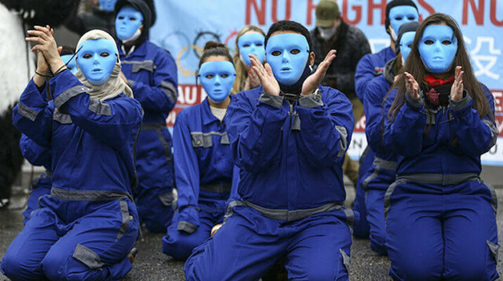 Əllərini də qandallayan nümayişçilər, Pekində keçiriləcək 2022 Qış Olimpiya Oyunlarının boykot edilməsini tələb etdilər və “No Rights, No Games” (Hüquq yoxdursa, oyun da yoxdur) yazılmış bir pankart açdılar.