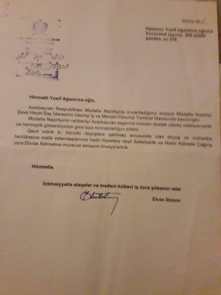 Müharibə veteranlarımız daim döyüşə can atdılar. Belə müharibə veteranlarımızdan biri də AVMVİB Xocavənd rayon şöbəsinin üzvü Yusif Həsənovdur. Müharibənin ilk günündən orduya yazılmaq üçün müraciət edən Yusif Həsənov 12 nəfərlik bir bələdçi qrupuna daxil edilib. Onlar ön xətdə gözləmə mövqeyində olublar. Lakin qəhrəman ordumuzun «Dəmir yumruğuna» tab gətirməyən düşmənin təslim olması onlar dayanan istiqamətdən hücuma imkan verməyib.