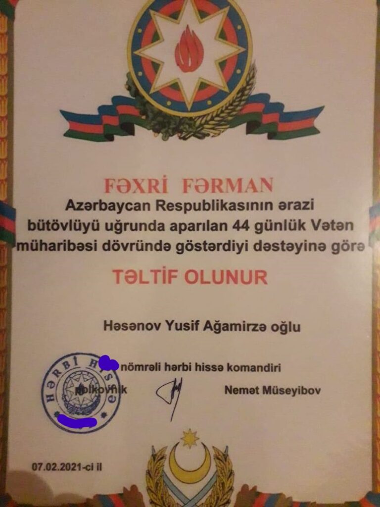 Müharibə veteranı Yusif Həsənov deyir: «Mənim əsas məqsədim döyüş vaxtı döyüşçü balalarımızın yanında olmaqdı. Biz AVMVİB üzvü olaraq hər birimiz buna can atdıq və etdik. AVMVİB qələbəyə aparan yolda oldu və dəstək verdi. Mən hərbi hissə tərəfindən Fəxri fərmanla təltif olundum. Bunu veteranlaın əməyinə verilən qiymət kimi qəbul edirəm».