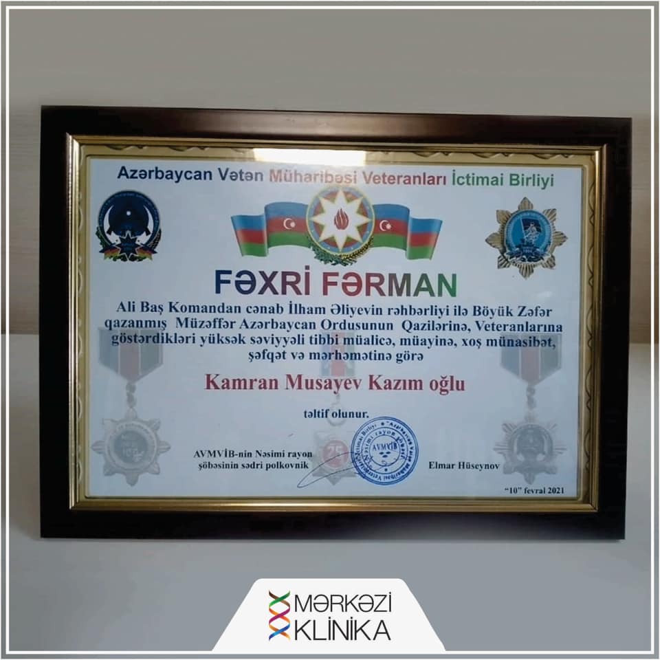 «Ali Baş Komandan cənab İlham Əliyevin rəhbərliyi ilə Böyük Zəfər qazanmış Müzəffər Azərbaycan Ordusunun Qazilərinə, Veteranlarına göstərdikləri yüksək səviyyəli tibbi müalicə, müayinə, xoş münasibət, şəfqət və mərhəmətinə görə Mərkəzi Klinika Xəstəxananın Baş həkimi, ürək-damar cərrahı Prof. Dr. Kamran Musayev Azərbaycan Vətən Müharibəsi Veteranları İctimai Birliyi tərəfindən “FƏXRİ FƏRMAN”la təltif olunmuşdur».