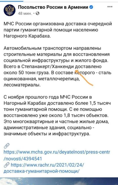 Rusiya Fövqəladə Hallar Nazirliyi ötən ilin noyabrından bu yana Dağlıq Qarabağa 1,5 min tondan çox humanitar yardım çatdırıb. Yardımın köməyi ilə artıq 1,8 min obyekt bərpa edilib. Bunlar çoxmənzilli və şəxsi yaşayış binaları, inzibati binalar, sosial əhəmiyyətli obyektlər və infrastrukturdur.