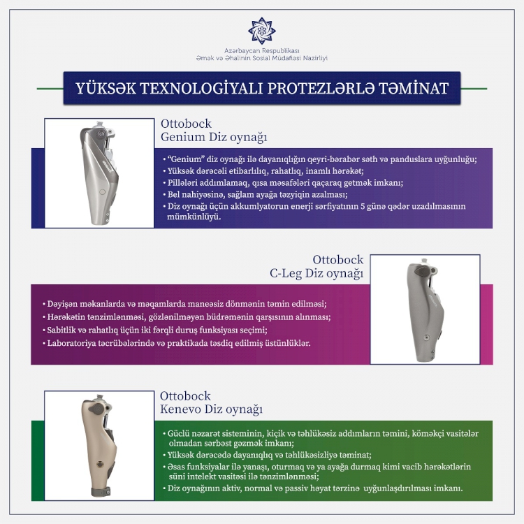 Prezident İlham Əliyevin tapşırığı ilə Əmək və Əhalinin Sosial Müdafiəsi Nazirliyi ölkəmizin ərazi bütövlüyü uğrunda döyüşlərdə yaralanaraq orqanlarını itirmiş vətəndaşlarımızın yüksək texnologiyalı, elektron protezlərlə təminatına başlayıb. Onların hər birinin müasir protez təminatı həyata keçiriləcək.