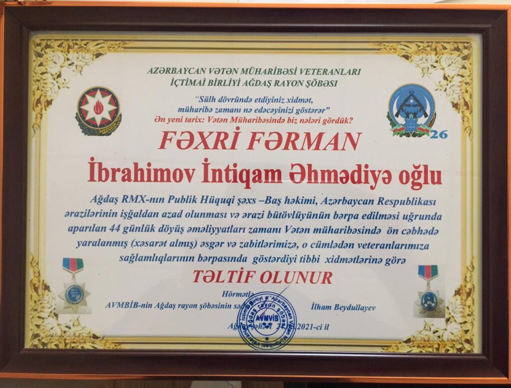 Tədbirdə Ağdaş rayon Mərkəzi Xəstəxananasının Publik Hüquqi Şəxsin Baş Həkimi İntiqam Əhmədiyə oğlu İbrahimov Azərbaycan Resbublikasi ərazilərinin işğaldan azad olunması və ərazi bütövlüyünün bərpa edilməsi uğrunda aparılan 44 günlük döyüş əməliyyatları zamanı Vətən Müharibəsində ön cəbhədə yaralanmış (xəsarət almış) əsgər və zabitlərimizə, o cümlədən müharibə veteranlarımıza sağlamlıqlarının bərpasında göstərdiyi tibbi xidmətlərə, xüsusi diqqət və qayğıya görə təşkilatimizin Fəxri Fərmani ilə təltif olundu.