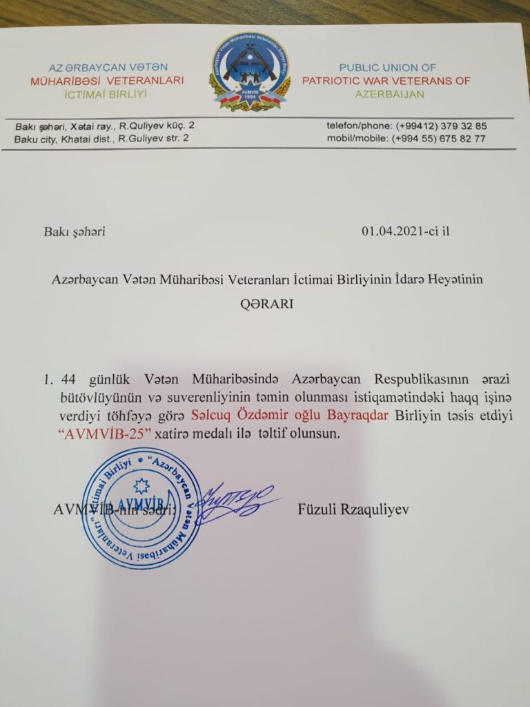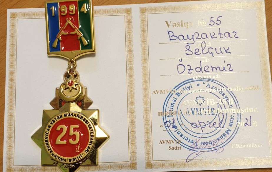 Vahid Abdurəhmanov bildirdi ki, bu gün Türk dünyasının fəxri olan Səlcuk Bayraktarı Birliyin təsis etdiyi «AVMVİB 25 İL» Xatirə medalı ilə təltif etməyi döyüşçülər öz mənəvi borcları hesab edirdilər. Düşmənə qarşı apardığımız Vətən müharibəsində rolu olmuş kimsəni unutmamağa çalışırıq. Belə şəxslərdən biri kimi üzvlərimizin istəyinə uyğun olaraq bu addımı atdıq və təltif münasibətiylə S. Bayraktarı təbrik edirik!