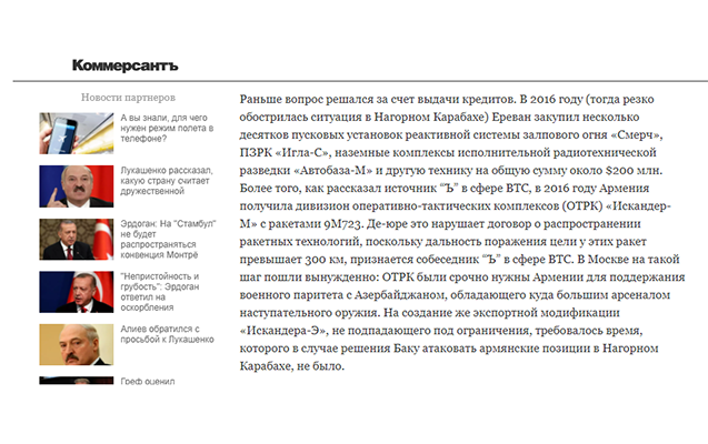 «Qafqazinfo” xəbər verir ki, bütün bunların fonunda sözügedən raket komplekslərinin Rusiya tərəfindən Ermənistana verilməsi hələ 3 il əvvəl Rusiya mətbuatında öz təsdiqini tapıb. Belə ki, 2018-ci ildə Ermənistanın yenicə Baş naziri olmuş Nikol Paşinyanın Rusiyaya səfəri ərəfəsində «Kommersant» nəşrində dərc olunmuş məqalədə Rusiyanın 2016-cı ildə Ermənistana «İsgəndər — M” raket komplekslərini satdığı qeyd olunub. Məqalədə bildirilib ki, Moskva raket texnologiyalarının yayılmasına dair müqaviləni pozsa da, bu addıma məcburən getməli olub.