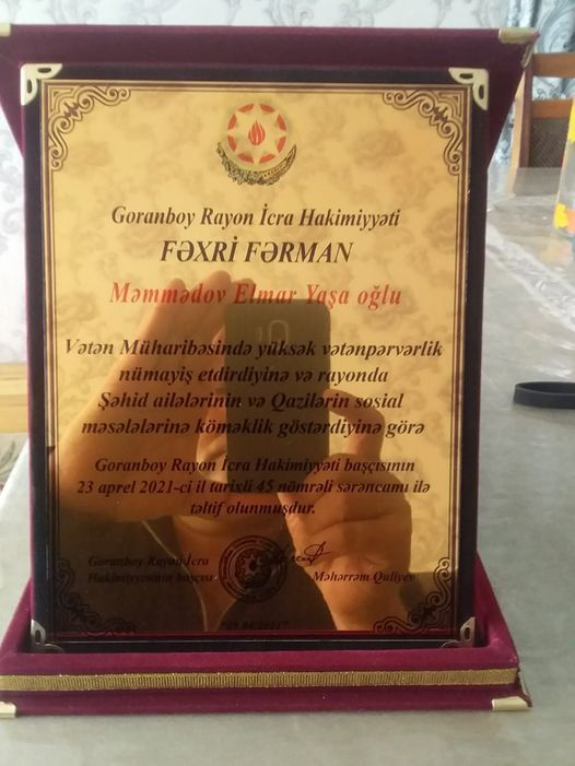 Azərbaycan Vətən Müharibəsi Veteranları İctimai Birliyi (AVMVİB) Goranboy rayon şöbəsinin sədri Elmar Məmmədov bildirdi ki, Goranboy rayon İcra Hakimiyyətinin başçısı cənab Məhərrəm Quliyevin rəhbərliyi ilə rayonda qazilərə və şəhid ailələrinə diqqət və qayğı cənab Ali Baş Komandan İlham Əliyevin tapşırıq və göstərişlərinə tam cavab verir. Goranboy rayon İcra Hakimiyyəti başçısı Məhərrəm Quliyev rayonun idarə-təşkilat rəhbərləri, inzibati ərazi dairələri üzrə nümayəndə və bələdiyyələrin iştirakı ilə, müşavirədə də cari məsələlərlə yanaşı Şəhid ailələri və Qazilərin sosial qayğılarının öyrənilməsi və problemlərin həllinin icra vəziyyətinin müzakirə olunması elə bu sahənin daim nəzarətdə olmasının göstəricisi sayıla bilər. Kimsə diqqətdən kənarda qalmır. Mənim Fəxri Fərmanla təltif edilməyim də elə bu diqqət və qayğının bir parçasıdır. Rayon veteranları adından bu diqqət və qayğıya görə, Goranboy rayon İcra Hakimiyyətinin başçısı cənab Məhərrəm Quliyevə öz minnətdarlığımı bildirirəm.