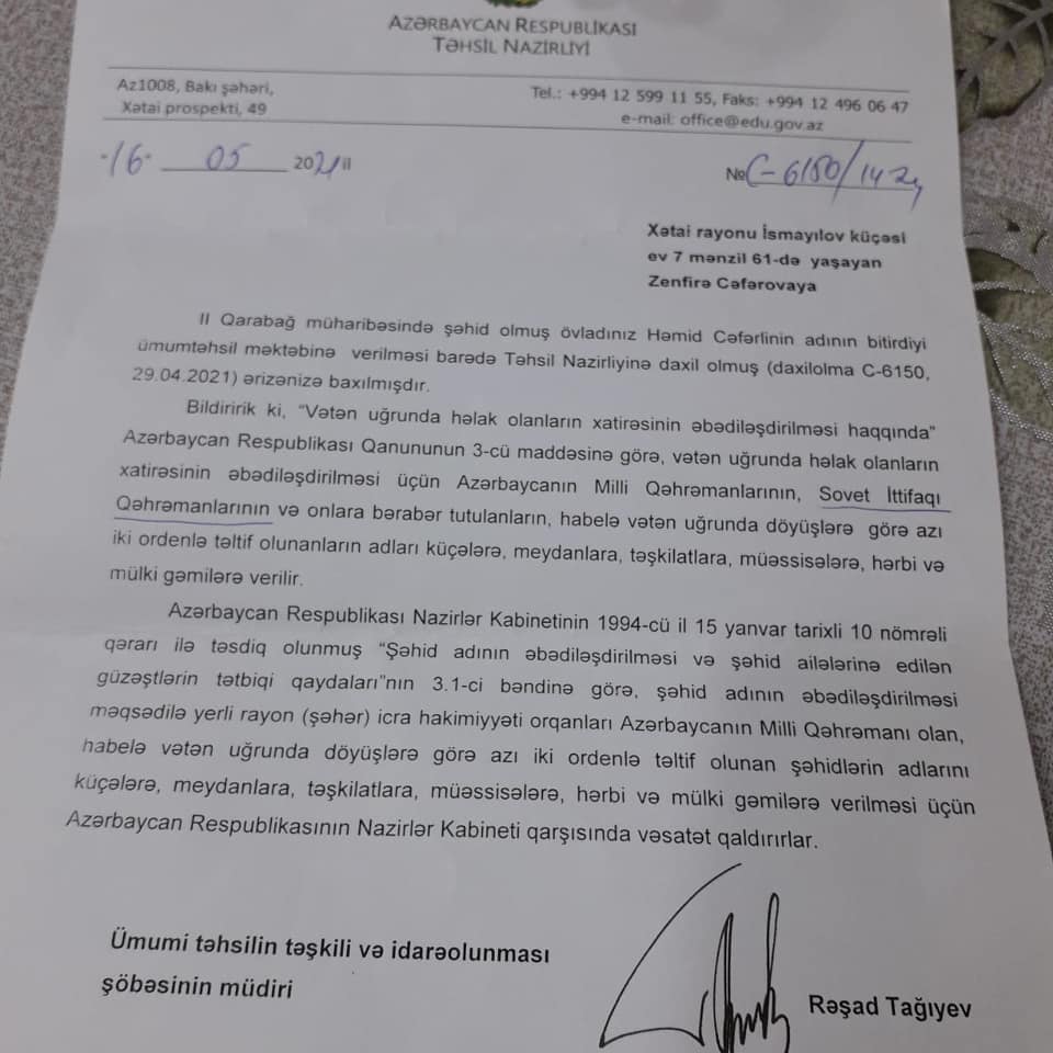 5 medala layiq görülmüş şəhid kapitan Həmid Cəfərlinin anası Təhsil Nazirliyinə müraciət edib ki, oğlunun oxuduğu 88 saylı (Zəkalar litseyi) məktəbə şəhidin adı verilsin.