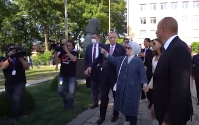 Azərbaycan Prezidenti İlham Əliyev, birinci xanım Mehriban Əliyeva və Türkiyə Prezidenti Rəcəb Tayyib Ərdoğan, birinci xanım Əminə Ərdoğan Şuşada Azərbaycanın tanınmış şəxsiyyətləri Natəvan, Bülbül və Üzeyir Hacıbəylinin heykəlləri önünə gəliblər.
