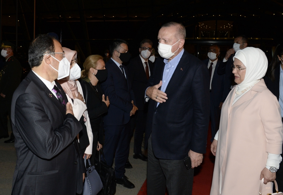 Türkiyə Respublikasının Prezidenti Rəcəb Tayyib Ərdoğanı və xanımı Əminə Ərdoğanı hava limanında Baş nazirin birinci müavini Yaqub Eyyubov, xarici işlər nazirinin müavini Xələf Xələfov və digər rəsmi şəxslər yola saldılar.
