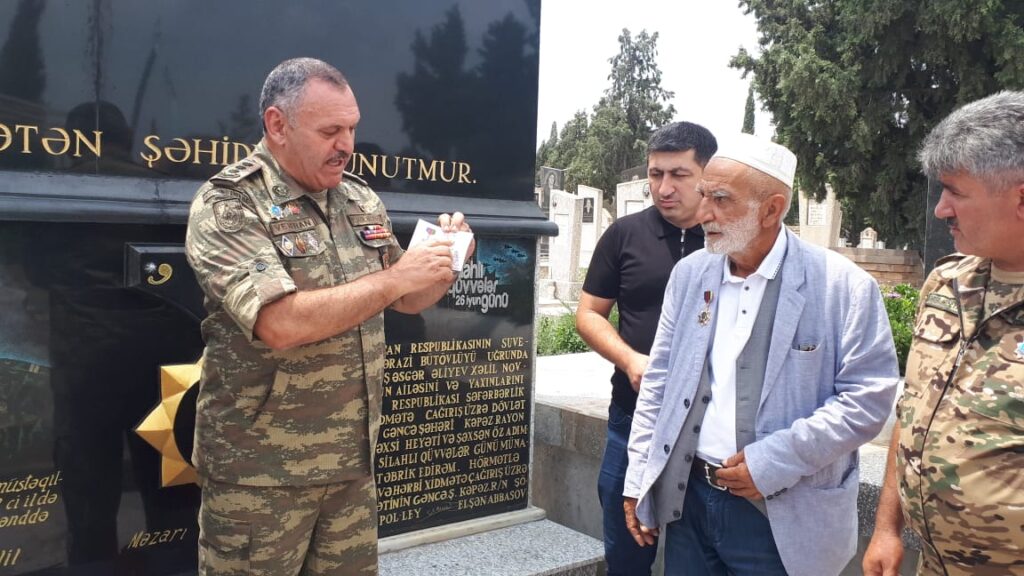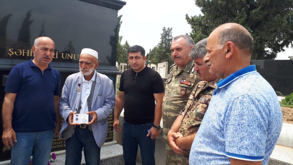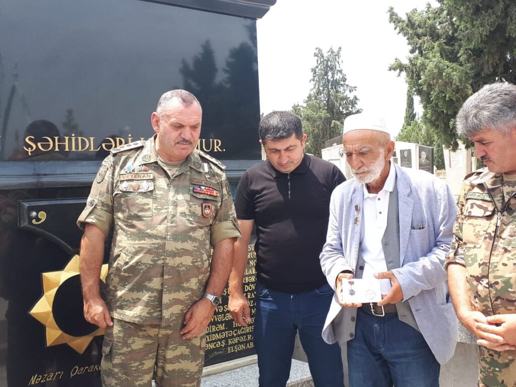AVMVİB sədrinin səlahiyyətli nümayəndəsi Elmar Hüseynov AVMVİB-nin sədri Füzuli Rzaquliyevin adından şəhidin atası Mirnovruz Əliyevə Birliyin Xatirə medalını təqdim edib.