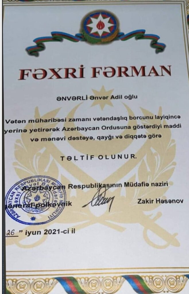 Bu da fakt. “Fəxri Fərman” Vətən müharibəsi zamanı vətəndaşlıq borcunu layiqincə yerinə yetirərək Azərbaycan ordusuna maddi və mənəvi dəstəyə, qayğı və diqqətə görə təltif olunur: Ənvərli Ənvər Adil oğlu.