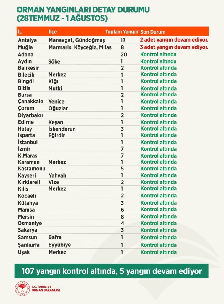 «İyulun 28-dən avqustun 1-dək 107 meşə yanğını nəzarət altına alınıb. Antalyada (Manavqat, Gündoğmuş) və Muğlada (Marmaris, Göycegiz və ilas) beş meşə yanğını davam edir”, — deyə nazir sosial şəbəkədəki hesabına yazıb.