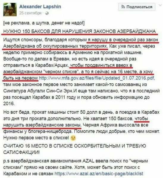 — Erməni Lapşinlə Qurban Məmmədovun əlaqələri davam etməkdədir. Qarabağa səfər etdiyinə görə Azərbaycan həbsxanasında olan bloqqer Aleksandr Lapşin Facebook səhifəsində bildirib ki, Azərbaycan Təhsil Nazirliyi Azərbaycan xalqının tarixi ilə bağlı yeni dərsliklər nəşr etməyə hazırlaşır, burada dövlətin yaradılması ilə yanaşı, mədəniyyətini və tarixini, bir neçə sətri ona, yəni Saşa Lapşinə həsr edəcək. «Bu səhər demək olar ki, öz yatağımdan gülməkdən yıxıldım. Bunu Avropada yaşayan tanış bir azərbaycanlı jurnalist yazdı (?!). Belə çıxır ki, Azərbaycan Təhsil Nazirliyi Azərbaycan xalqının tarixi ilə bağlı yeni dərsliklər nəşr etməyə hazırlaşır. dövlətin, mədəniyyətinin və tarixinin bir neçə sətri mənə həsr olunacaq, Sverdlovskdan Saşa Lapşin. «Tarixin mərhələləri» bölməsi, aşağıdakılar olacaq: «…