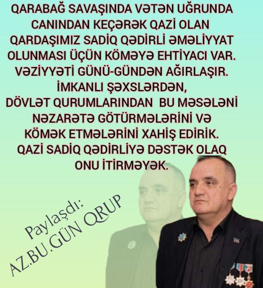 Müharibədə özünü Vətənə sipər edən veteranımız Sadiq Qədirlini xəstəliklə mübarizədə tək qoymayaq. Vətənpərvər və vicdanlı soydaşlarımızı Sadiq Qədirliyə yardımçı olmağa çağırırıq!