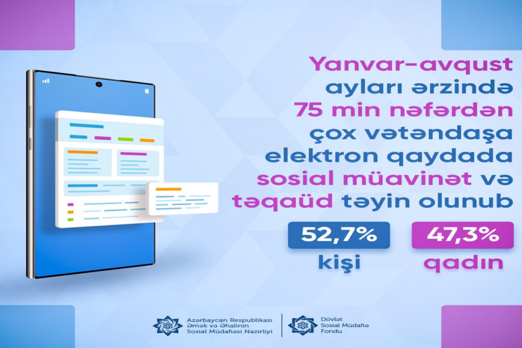 Dövlət Sosial Müdafiə Fondundan (DSMF) verilən məlumata görə, 2021-ci ilin yanvar-avqust ayları ərzində 75 min nəfərdən çox vətəndaşa elektron qaydada sosial müavinət və təqaüd təyin olunub.