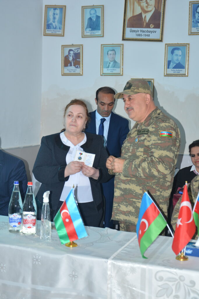 İslam Səfərov Birlik adından AVMVİB-nin təsis etdiyi «Milli ordunun 100 il» Xatirə medalını şəhid E. Məmişovun bacısı Həqiqət Məmişovaya təqdim etdi.
