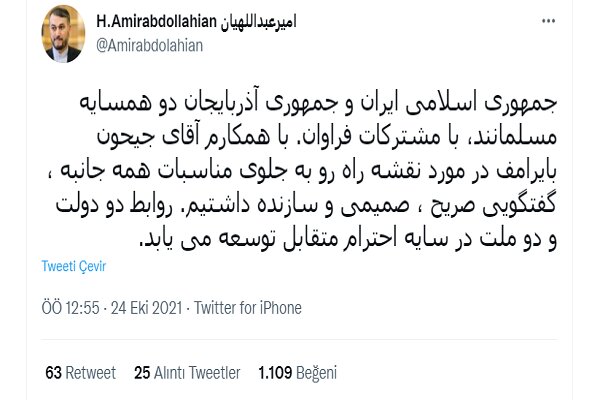İranın Xarici İşlər naziri Hüseyn Əmir Abdullahiyan şəxsi Tvitter hesabında dünən azərbaycanlı həmkarı Ceyhun Bayramovla telefon danışığını dəyərləndirib.