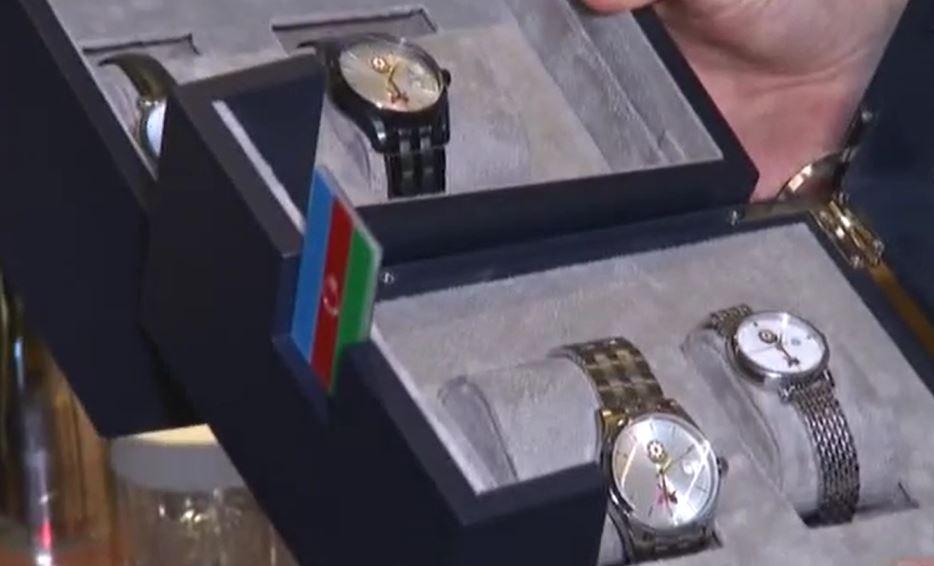 Prezident İlham Əliyev deyib: “Təşəkkür edirəm. Gəlin, yaxından çəkin. Əziz qardaşım mənə bu gözəl saatları hədiyyə edib. Xarıbülbül təsviri də üstündə”.