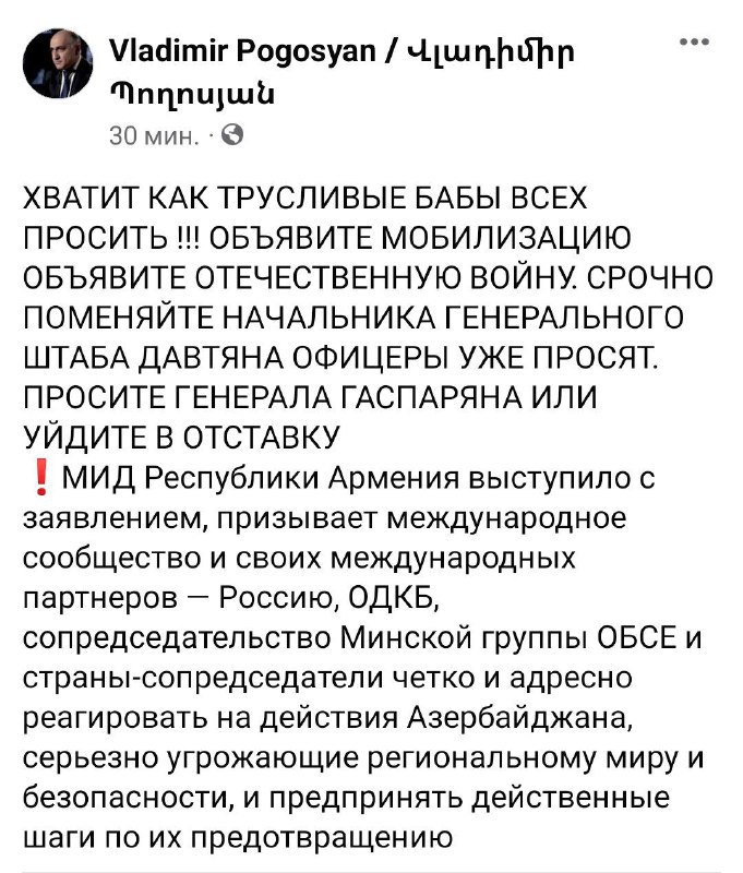 Bu sözləri Ermənistan Baş Qərargah rəisinin keçmiş müşaviri Vladimir Poqosyan öz Facebook səhifəsində yazıb. Poqosyan Ermənistan rəsmilərini “Vətən Müharibəsi” elan etməyə çağırıb.