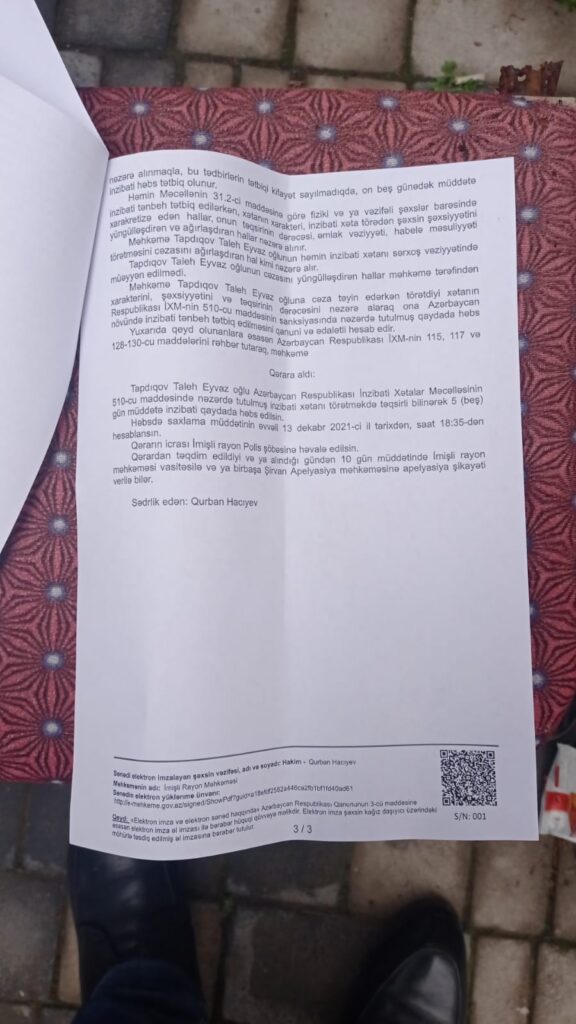 İmişlidə İcra Hakimiyyətinin özbaşınalığı sərhəd tanımır və bu adama «DUR!» deyən tapılmır. Azərbaycan Vətən Müharibəsi Veteranları İctimai Birliyi (AVMVİB) İmişli rayon şöbəsinin sədri Taleh Tapdıqovun qanunsuz həbsi 84 minlik veteranlar ordusunun dərin hiddətinə səbəb olub.