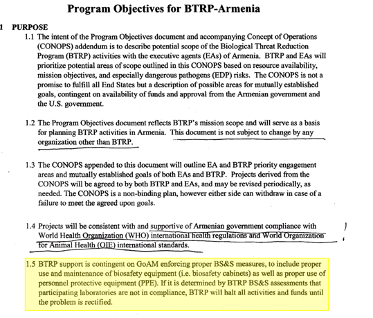 Mütəxəssislər 2001-ci ildə Birləşmiş Ştatların Bakterioloji və Toksin Silahlarının İşlənməsinin, İstehsalının və Ehtiyatının Qadağan edilməsi və Onların Məhv edilməsi haqqında Konvensiyaya (BTWC) qarşılıqlı nəzarəti nəzərdə tutan protokolu qəbul etməkdən imtina etdiyini xatırladaraq dəfələrlə həyəcan təbili çalıblar. Bu o deməkdir ki, Pentaqon postsovet məkanında maliyyələşdirdiyi biolaboratoriyalarla bağlı müstəqil təhqiqat imkanlarını istisna etməklə məsuliyyətdən azad olub».