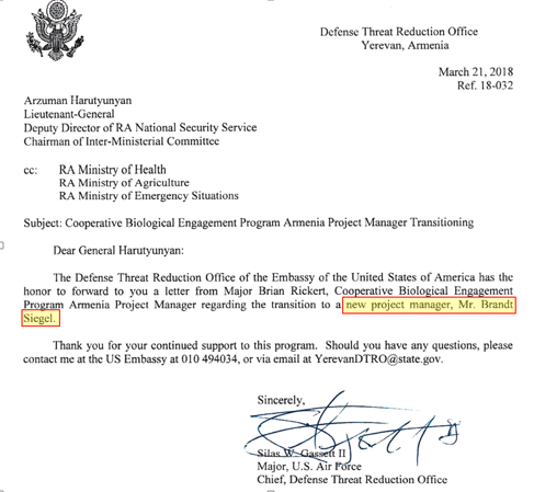 Bu obyektlərin Amerika mənsubiyyəti podratçılar siyahısı ilə təsdiqlənir. Bu, xüsusən Ermənistanda laboratoriyalar və informasiya şəbəkəsi yaratmaq üçün DTRA-dan 50 milyon dollar alan CH2M Hilldir. Bu şirkət, öz növbəsində, Black & Veatch-in vasitəçiliyi ilə, uzun illər bioloji silahlar hazırlayan daha iki subpodratçı cəlb edib. Marqarita Simonyanın «Sputnik»i də bu barədə məlumat verərək yazırdı: «Memorandumun bağlanması ilə bağlı danışıqlar 2019-cu ilin noyabrında başa çatıb, belə ki, Lavrovun özü o vaxt Yerevanda bu haqda danışıb. Ermənistanda biolaboratoriyalar haqqında memorandum demək olar ki, imzalanmağa hazır idi, bütün vacib müddəalar razılaşdırıldı, lakin Rusiya tərəfi sənədin mətninin yekunlaşdırılmasını təklif etdi. Sonra Lavrovun İrəvana səfəri zamanı sənəd imzalanmadı. Mübahisəyə nəyin səbəb olduğu barədə məlumat verilməsə də, media rusiyalı mütəxəssislərin obyektlərə girişi barədə danışılırdı. Sonra koronavirus pandemiyası baş verdi. 2020-ci ilin mayında Ermənistan Xarici İşlər Nazirliyi bəyan etdi ki, sənəd heç bir tərəfin laboratoriyaya daxil olmaq hüququnu nəzərdə tutmur»…