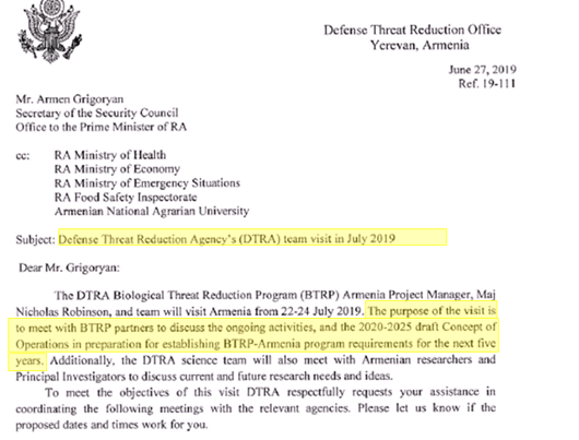 Ermənistan mutasiyaya uğramış virusların yayılmasının qeydə alındığı və onların bəzilərinin ölkədən bütün Transqafqazda yayıldığı ölkədir ki, bu da amerikalılara biosilahların həm sərhədlərdə, həm də Rusiyanın cənubunda və İranda təbii şəkildə necə “işləyə biləcəyi” barədə kifayət qədər imkan verir. Pentaqon Ermənistanda yalnız biolaboratoriyaların və informasiya şəbəkəsinin yaradılmasına artıq 50 milyon dollardan çox pul xərcləyib».