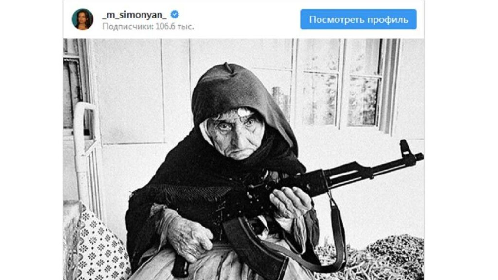 Əlinə pulemyotu kimə qarşı alacağını dəqiqləşdirmədən. Amma eyni zamanda istifadəçilər başa düşdülər ki, o, bu erməni nənə kimi “evini” avtomatla “düşmənlərdən” müdafiə etməyə hazırdır. Rusiya mətbuatında isə bu kimi uzaqgörən həvəsli şərhlər yer aldı: «Silahlı nənə — RT-nin baş redaktoru öz idealından danışdı».