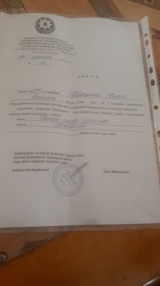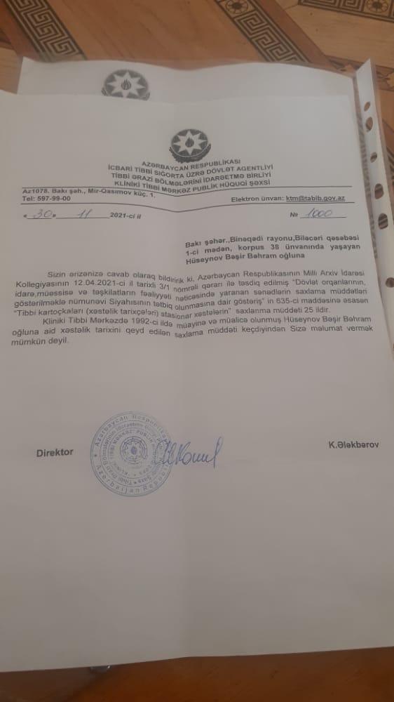Yaxud ikinci bir müraciət isə Birinci Qarabağ müharibəsi veteranı Bəşir Bəhram oğlu Hüseynovdan daxil olub. Müharibə veteranı yaralanıb müalicə olunduğu xəstəxanadan müalicəsi haqqında arayış ala bilməməsindən şikayətçidir. İcbari Tibbi Sığorta Üzrə Dövlət Agentliyi Tibbi Ərazi Bölmələrini İdarəetmə Birliyi Kliniki Tibbi Mərkəz Publik Hüquqi şəxsin direktoru Könül Ələkbərovun imzasıyla veterana cavab verilib: «Sizin ərizənizə cavab olaraq bildirik ki, Azərbaycan Respublikasının Milli Arxiv Idarəsi Kollegiyasının 12.04.2021-ci il tarixh 3/1 nomrəli qaranı ilə tasdiq edilmiş «Dövlət orqanlarının, idarə, müəssisə və təşkilatların fəaliyyəti nəticəsində yaranan sənədlərin saxlama müddəti göstərilməklə nümunəvi Siyahısının tətbiq olunmasına dair göstəris»in 635-ci maddəsinə əsasən «Tibbi kartoçkaları (xəstəlik tarixçələri) stasionar xəstələrin» saxlanma müddəti 25 ildir. Kliniki Tibbi Mərkəzdə 1992-ci ildə müayinə və müalicə olunmuş Hüseynov Bəşir Bəhram oğluna aid xəstəlik tarixini qeyd edilən saxlama müddəti keçdiyindən Sizə məlumat vermək mümkün deyil».